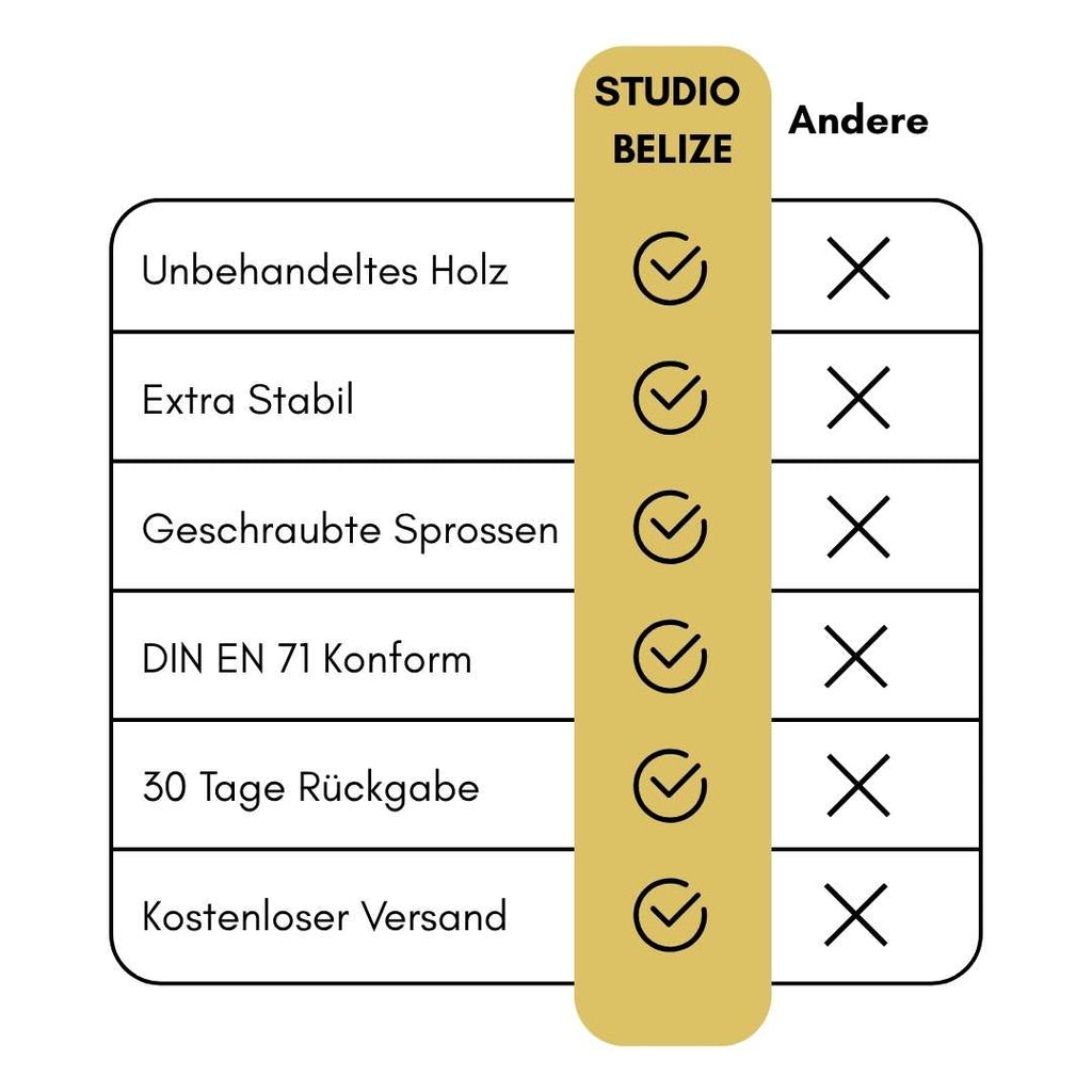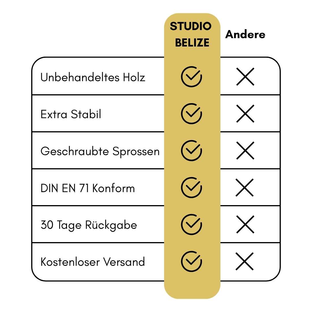 Nachhaltig - gefertigt aus lange getrocknetem und spannungsfreiem Naturholz, mit verschraubten Sprossen. Für nachhaltigen Spielspaß, der an Generationen weitergegeben werden kann.